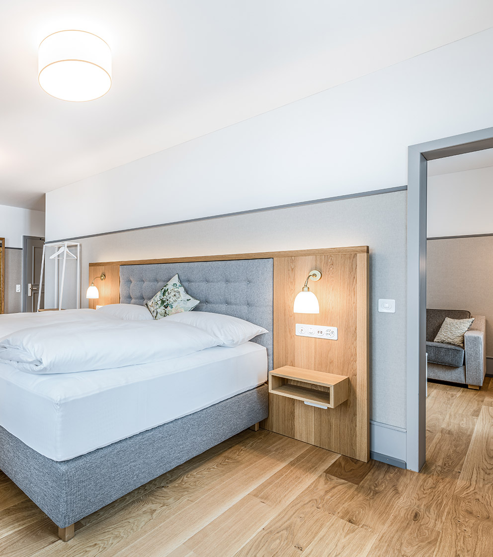 Unsere Familiensuiten bietet mit einem separaten Schlafzimmer und einem charmanten Wohnbereich auf 36 m² viel Raum für gemeinsame Zeit – ideal für Familien mit bis zu 5 Personen. Das gemütliche Sofa lässt sich in ein grosses Doppelbett verwandeln und bei Bedarf kann ein Zustellbett bereitgestellt werden. Im separaten Schlafzimmer sorgt das hochwertige Boxspringbett (180 x 200 cm) für erholsamen Schlaf, während das private Badezimmer eine geräumige Dusche sowie Kosmetikspiegel und einen Fön bietet.
