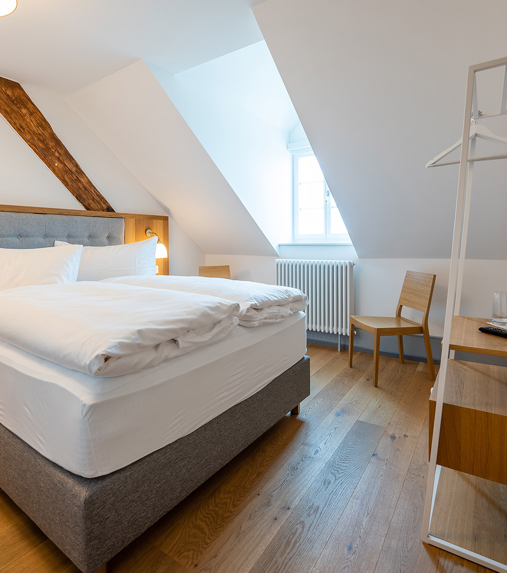 Nos chambres doubles supérieures avec lit Queen Size de 16 m² peuvent accueillir jusqu’à 2 personnes et allient élégance sobre et charme rustique. Les pentes de toit et les poutres en bois apparentes créent une atmosphère chaleureuse et accueillante. Le lit boxspring de haute qualité (160 x 200 cm) garantit un sommeil réparateur.